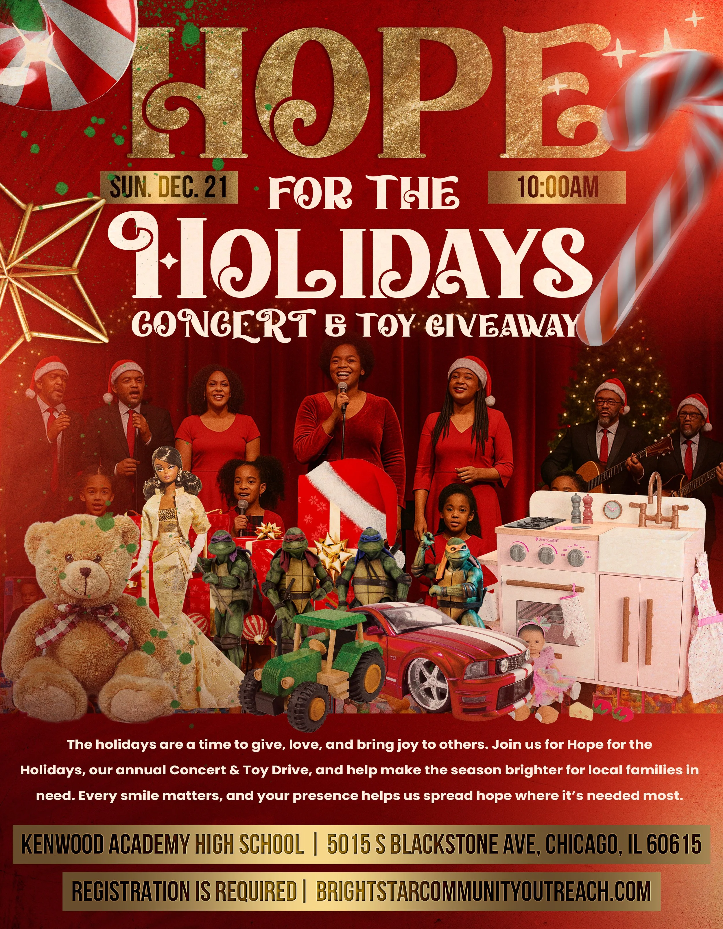 Join us for Hope for the Holidays, our annual Concert and Toy Giveaway on Sunday, December 21 at 10:00 AM at Kenwood Academy High School, 5015 S Blackstone Ave, Chicago, IL 60615. The holidays are a time to give, love, and bring joy to others, and this special celebration brings our community together through music, laughter, and generosity. Families will enjoy a powerful concert experience and children will receive free toys to make the season brighter. Every smile matters, and your presence helps us spread hope where itβs needed most. Registration is required and families must be present to receive toys. Visit brightstarcommunityoutreach.com to register today.