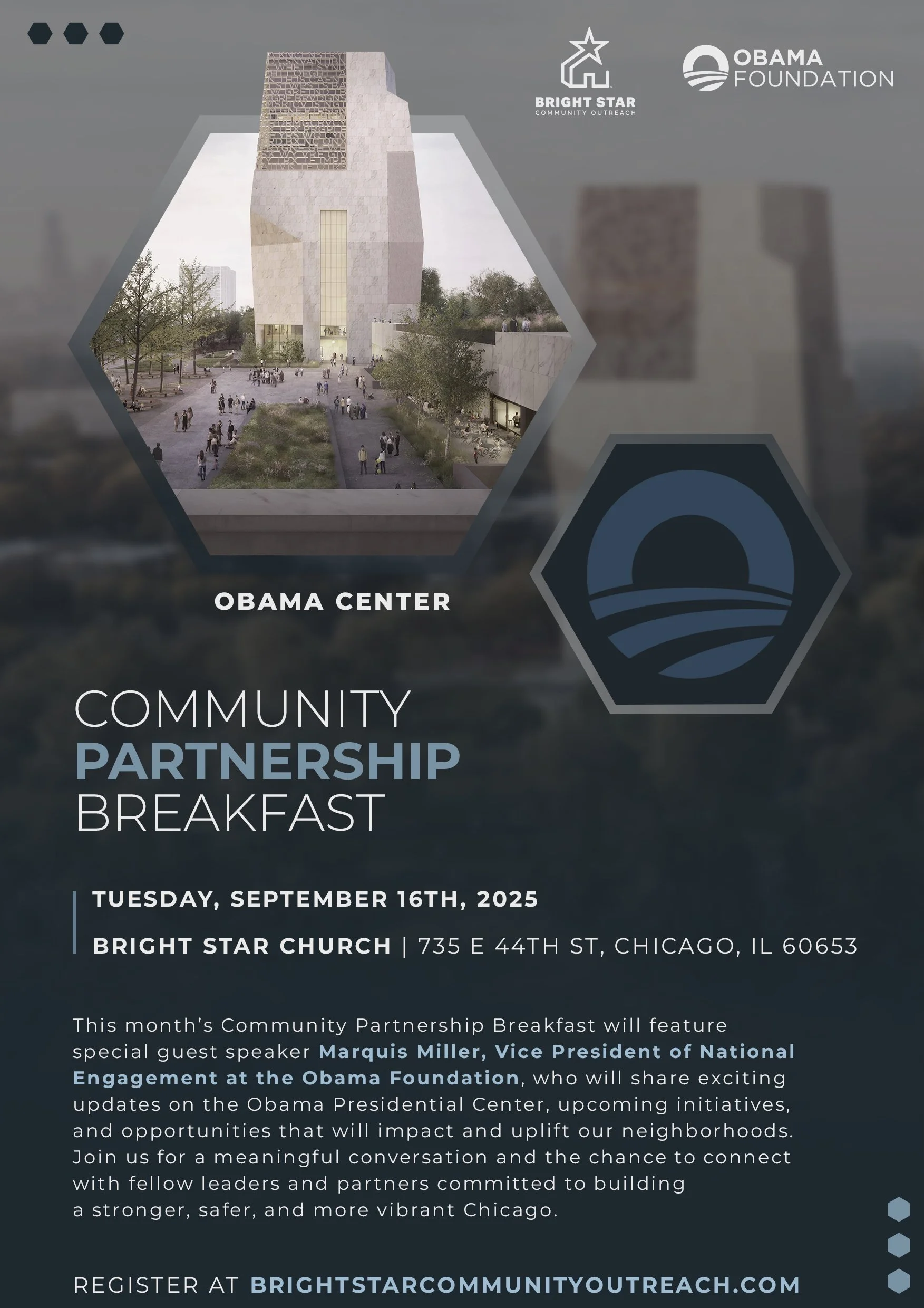 The Community Partnership Breakfast will be held on Tuesday, September 16, 2025, at Bright Star Church, 735 E 44th St, Chicago, IL 60653. This month’s breakfast will feature special guest speaker Marquis Miller, Vice President of National Engagement at the Obama Foundation, who will share exciting updates on the Obama Presidential Center, upcoming initiatives, and opportunities that will impact and uplift our neighborhoods. Attendees will engage in meaningful conversation and connect with fellow leaders and partners committed to building a stronger, safer, and more vibrant Chicago. Register below to reserve your spot.